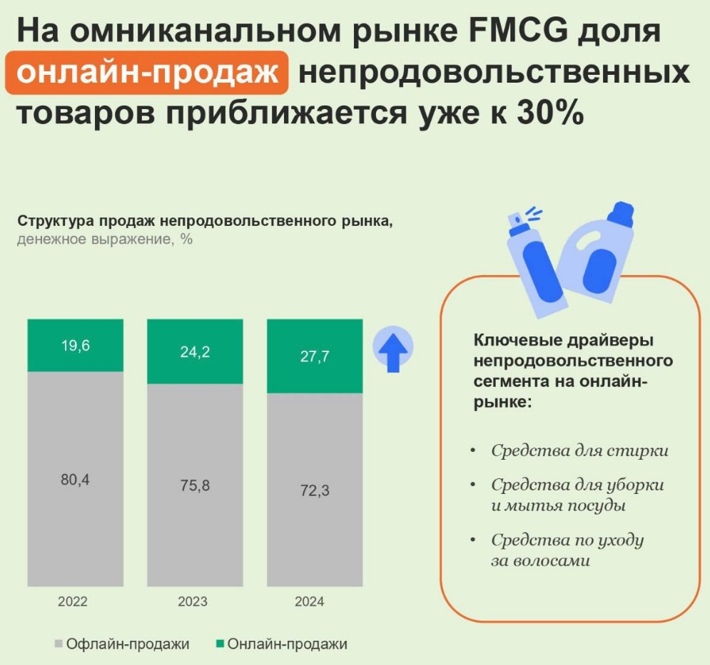 Доля онлайн-продаж непродовольственных товаров на рынке FMCG (товаров повседневного спроса) продолжает стремительно расти и, по данным Nielsen, приближается к отметке в 30%. В 2024 году этот показатель достиг 28% в денежном выражении, что значительно выше 24% годом ранее.