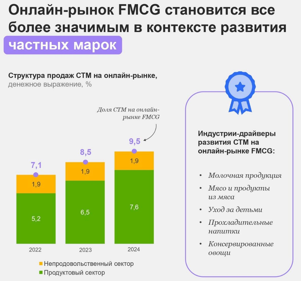 Одной из ключевых особенностей онлайн-рынка FMCG является высокая доля продаж именно непродовольственных товаров. Кроме того, 2024 год ознаменовался значительным развитием сегмента СТМ (собственные торговые марки). Впервые на частные марки в онлайн-сегменте пришлось почти 10% оборота рынка FMCG.