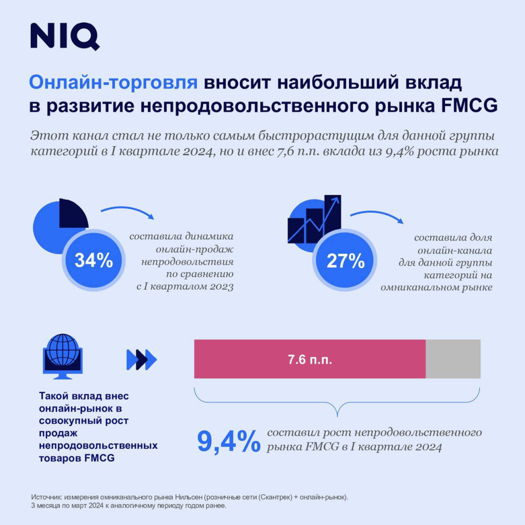 Интернет-магазины и маркетплейсы стали главными драйверами роста всего омниканального рынка непродовольственных товаров FMCG. Из 9,4% общего прироста продаж 7,6 п.п. обеспечили именно онлайн-площадки.