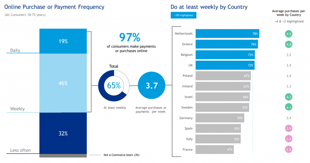 97% потребителей по всей Европе делают онлайн-покупки, говорится в отчёте PayPal e-Commerce Index. При этом две трети (65%) покупают что-то в онлайне как минимум раз в неделю, а среднее количество транзакций — 3,7 в неделю. Голландские и греческие покупатели самые активные. Греки что-то заказывают 4.8 раза в неделю.