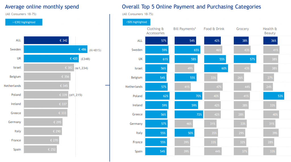В среднем онлайн-покупатели в Европе тратят €342 в месяц на интернет-покупки. Больше всех тратят жители Швеции и Великобритании — €486 и €420 соответственно. На третьем месте - Израиль (€382), который авторы отчёта также считают Европой.