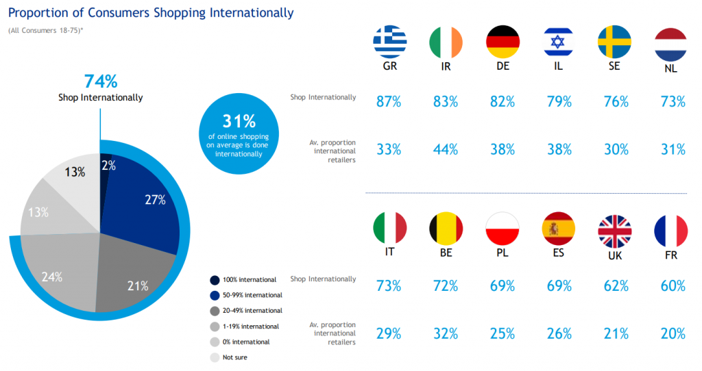 31% онлайн-покупок европейцы делают за рубежом. Кроссбордерные покупки в моде: например, их делают 87% греков и 83% ирландцев. Доля кросс-бордера в Ирландии при этом составляет 44% от всех онлайн-продаж. В Германии этот показатель 38%, а в Израиле 38%.