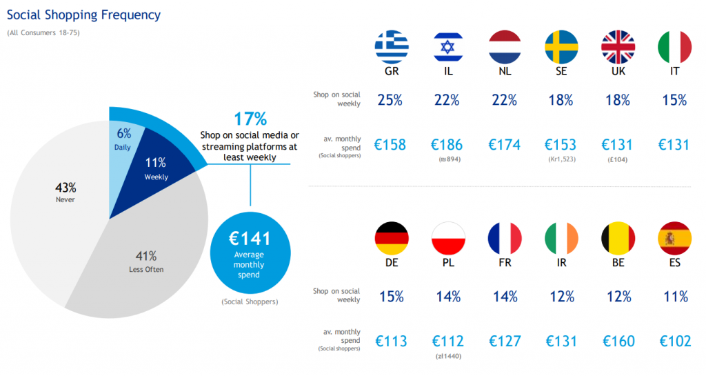 17% потребителей делают покупки через социальные сети или потоковые платформы как минимум раз в неделю. При этом в среднем на такие покупки уходит €141 в месяц.