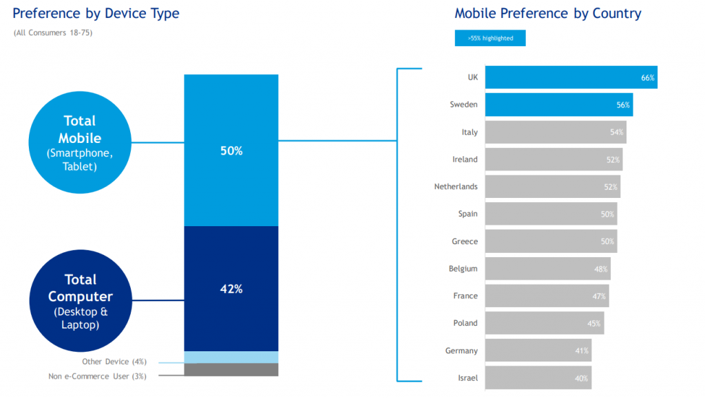 В среднем потребители предпочитают мобильные устройства для совершения покупок и платежей в интернете. Самая активная мобильная аудитория в Великобритании, где 66% потребителей выбирают mCommerce.