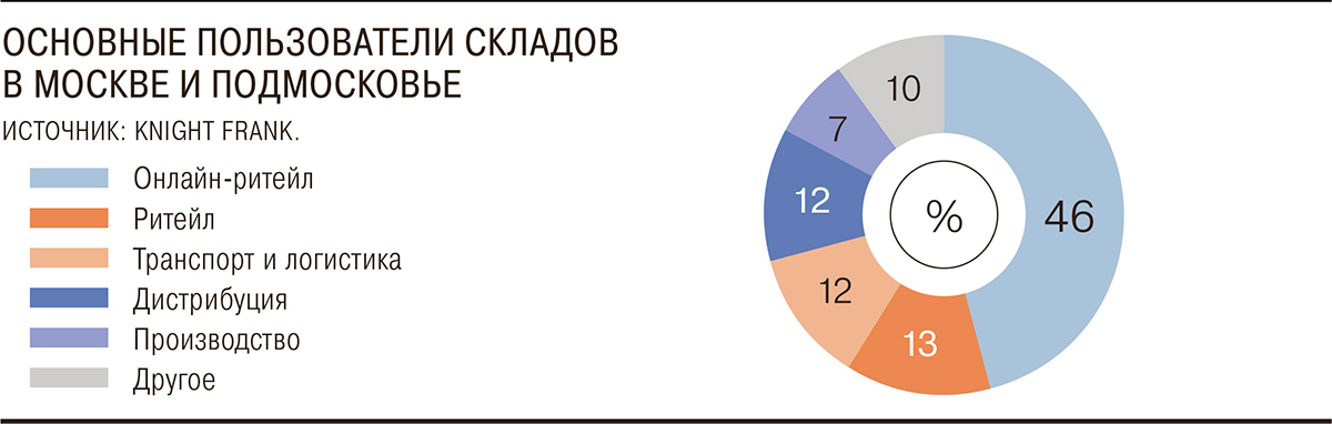 Основной запрос на склады и распределительные центры идёт со стороны онлайн-торговли. По данным Knight Frank, по итогам первой половины 2021 года объем сделок на рынке складской недвижимости Московского региона превысил 922 тыс. м², что в два раза больше аналогичного показателя 2020 года (468 тыс. кв. м). На сегмент онлайн-торговли пришлось 46% совокупного объема сделок, что в абсолютных значениях составляет более 425 тыс. м².