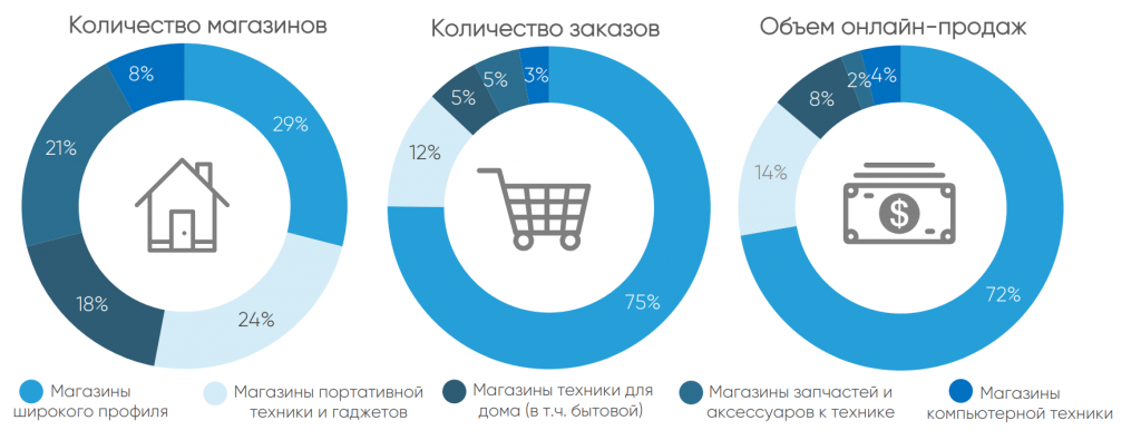 Доля интернет-магазинов бытовой техники и электроники составила (по количеству заказов) 14% от всего объёма товаров, проданных в российских интернет-магазинах. Доля по объему выручки составила 34% от рынка.