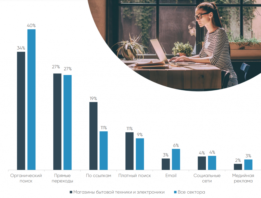 Для посещения интернет-магазинов бытовой техники и электроники покупатели в равной степени используют десктоп и мобильные устройства. Интересно, что магазины в этом сегменте отличает пониженная доля органических переходов из поиска (34% против 40% в среднем по рынку) и повышенная доля переходов из "прочих" (неклассифицированных) источников (19% против 11%).