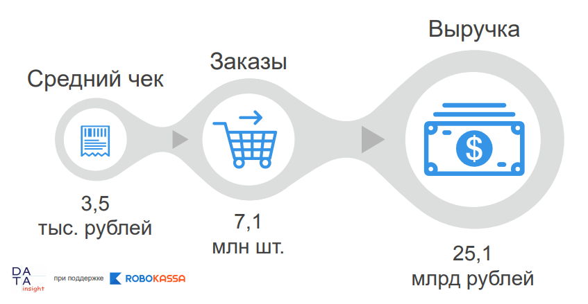В период с 07.2016-06.2017 было оформлено 7,1 млн заказов на сумму 25,1 млрд рублей, отмечают аналитики. При этом средний чек в категории детских товаров составил 3 500 рублей.