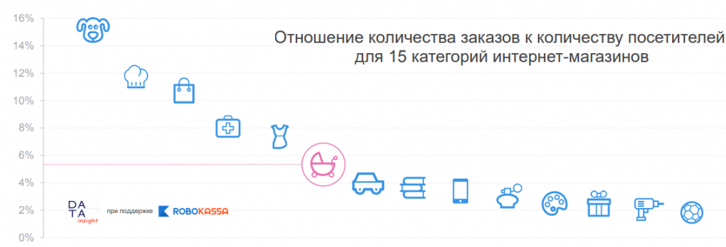 Конверсия продаж в секторе детских товаров составила 5,3%. Это примерно средний показатель по рынку. Ближайшие цифры - в интернет-магазинах одежды и обуви и магазинах автозапчастей.