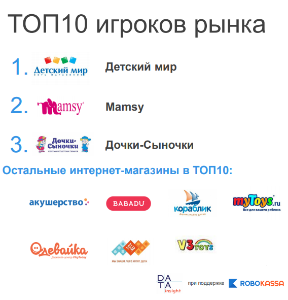 Лидером онлайн-рынка детских товаров является компания "Детский мир". Доля этого магазина по объему онлайн-продаж рынка составляет 26%.