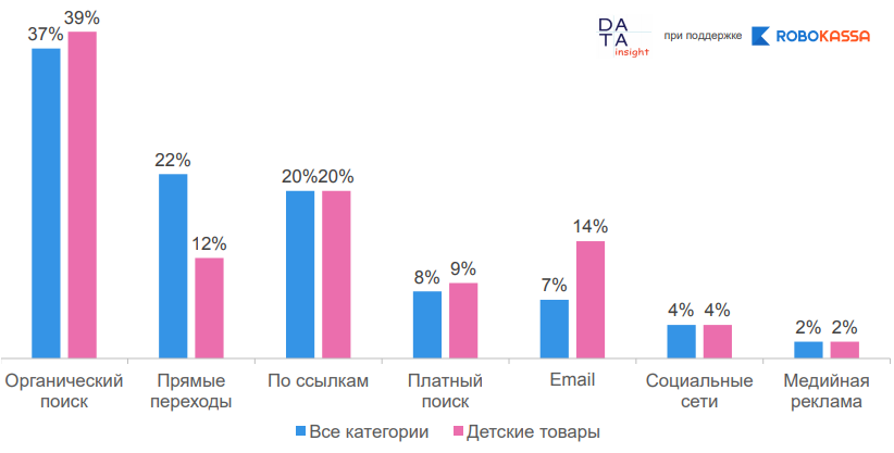 Доля email-трафика у интернет-магазинов детских товаров в два раза выше, чем в среднем у всех категорий. А доля прямых переходов на сайт значительно ниже среднего показателя