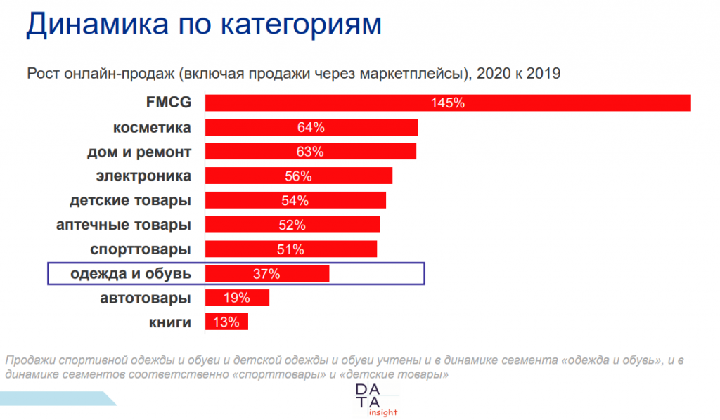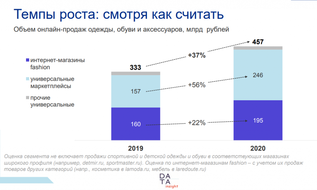 По данным Data Insight, объем онлайн-продаж одежды, обуви и аксессуаров по итогам 2020 года вырос на 124 млрд руб. (+37%) и достиг 457 млрд руб. Об этом рассказал партнер Data Insight Борис Овчинников на конференции Fashion Tech Day. Это далеко не рекорд: категория FMCG, например, выросла сразу на 145%.