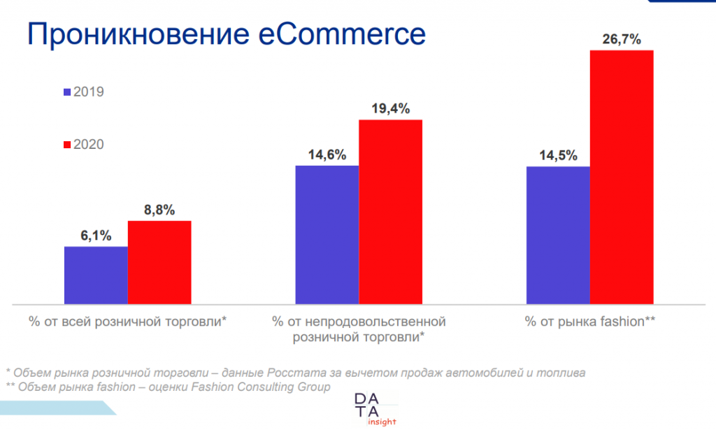 Проникновение eСommerce на рынок fashion увеличилось почти в два раза - с 14,5 до 26,7%. Это огромный рост: по всему рынку eCommerce увеличение проникновения меньше 3%.