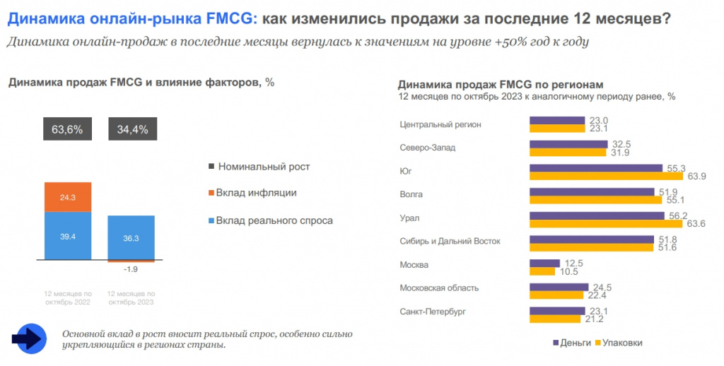 Объёмы онлайн-рынка FMCG приближаются уже к 10% от всех продаж ритейла. Среди наиболее значимых драйверов такого роста — спрос в регионах России и развитие маркетплейсов.
