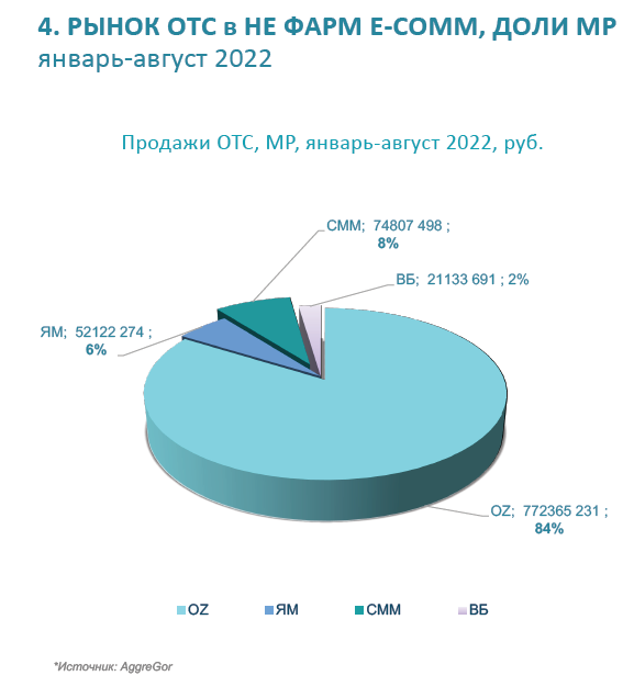 Однозначным лидером среди маркетплейсов в сегменте остаётся Ozon, который проводит около 84% продаж. (Данные не учитывают сумму продаж лекарственных средств (FBS площадки Яндекс Маркета, которые доставляются в точки выдачи аптеки) по системе по системе дропшиппинг).