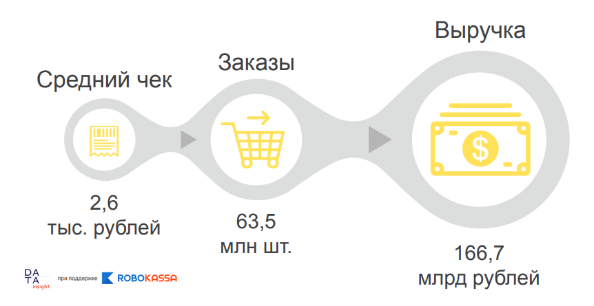 Средний чек в сегменте упал за год. В 2017 году он составил 2 600 рублей. Это ниже среднего чека по всему eCommerce-рынку.