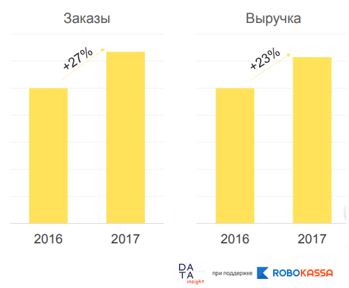 В 2017 интернет-магазины одежды оформили на 27% больше заказов, чем в 2016. За тот же период времени сумма онлайн продаж увеличилась на 23%.