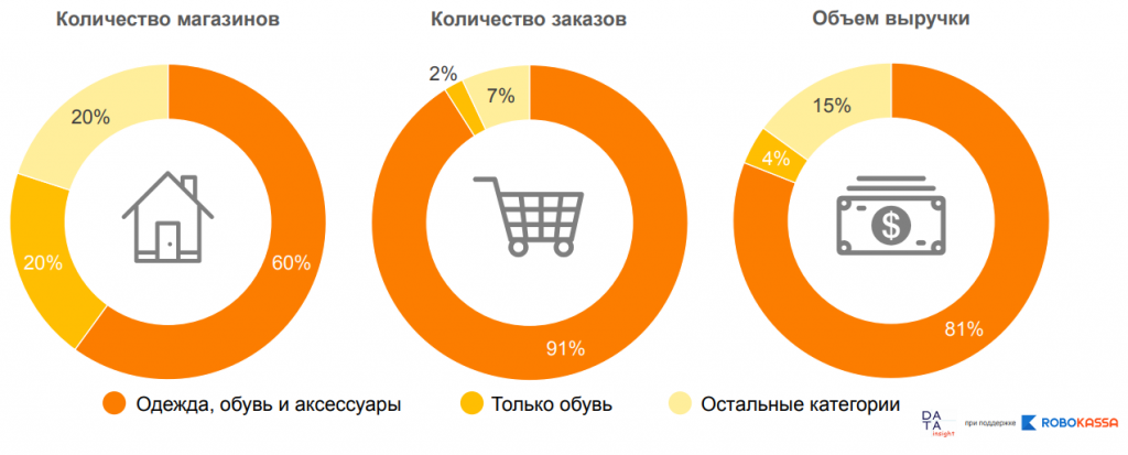 33% от всех онлайн-заказов 1000 крупнейших магазинов в 2017 года были сделаны в интернет-магазинах одежды и обуви. Поскольку средний чек в секторе ниже среднего чека по всему рынку интернет-торговли, доля по объему выручки оказалась ниже - 19%.