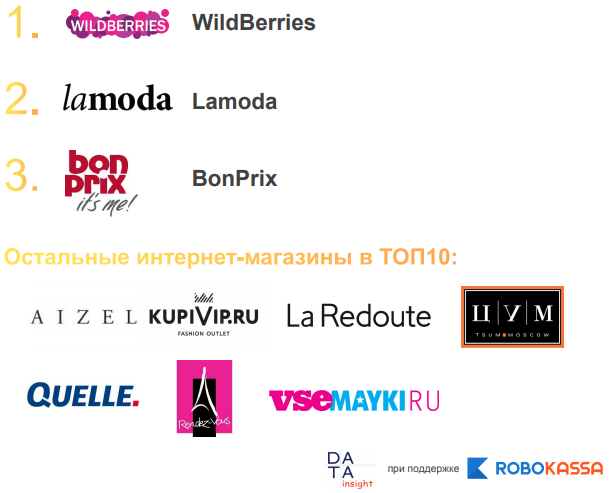 Однозначным лидером категории является интернет-магазин Wildberries. Доля этого магазина по объему онлайн-продаж среди всех интернет-магазинов сегмента из ТОП1000 за 2017 год составила целых 38%!