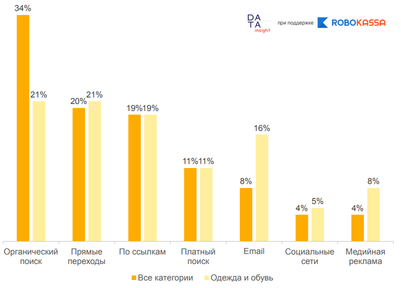 Очень хорошим источником трафика в сегменте являются почтовые рассылки. Доля переходов в интернет-магазины одежды и обуви из электронной почты в два раза выше, чем в среднем для всех категорий интернет-магазинов.