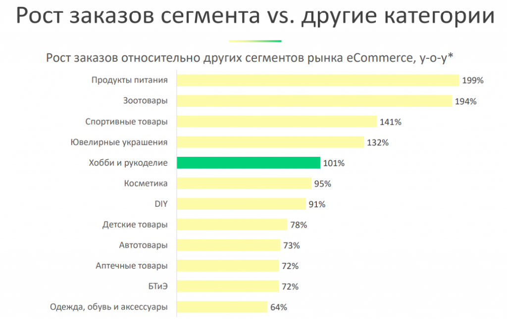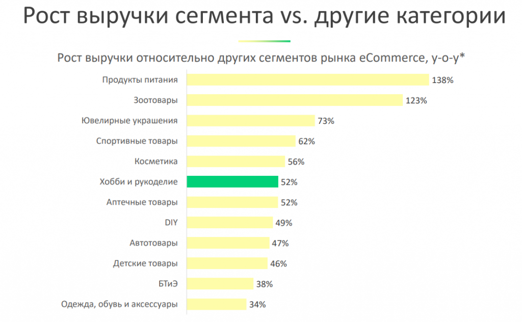 К концу 2021 года по темпам роста продаж категория занимала 6 место, а по темпам роста количества заказов – 5, уступая продуктам питания, зоотоварам, спортивным товарам, ювелирным украшениям и (только по динамике продаж в рублях) косметике. На долю интернет-магазинов товаров для хобби и рукоделия в 2021 году пришлось 2% российского рынка eCommerce по количеству онлайн-заказов и 1% - по объему онлайн-продаж в рублях.