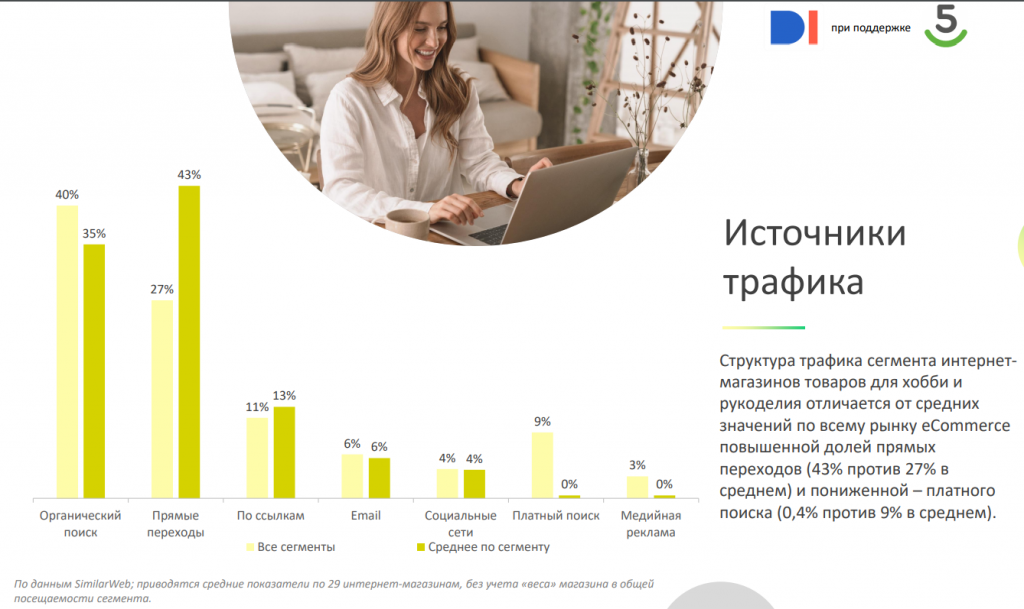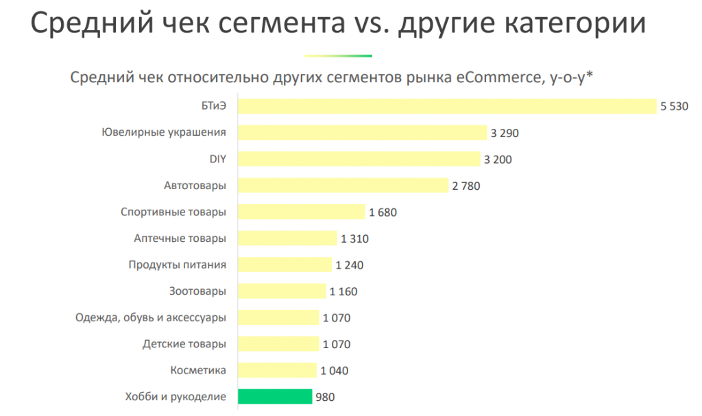 Средний чек в сегменте является самым низким на всём рынке eCommerce – всего 980 руб. Ближайший показатель у сегмента косметики – 1 040 руб. Конверсия сектора товаров для хобби и рукоделия составила 2,8% (без учета маркетплейсов).