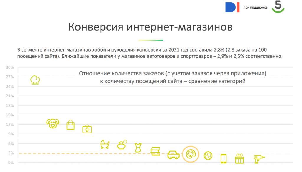 В сегменте интернет-магазинов хобби и рукоделия конверсия за 2021 год составила 2,8% (2,8 заказа на 100 посещений сайта). Ближайшие показатели у магазинов автотоваров и спорттоваров – 2,9% и 2,5% соответственно.
