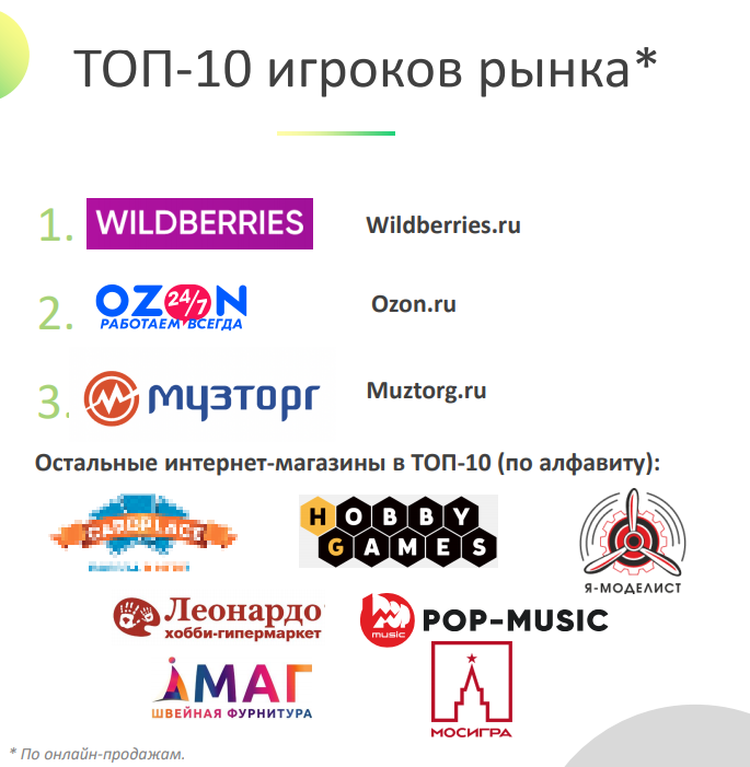 Отметим, что в исследовании приведены данные по 27 магазинам, специализирующимся на продажах товаров для шитья, вязания, а также тканей, швейной фурнитуры, музыкальных инструментов, художественных принадлежностей, сборных моделей и настольных игр и 2 крупнейшим универсальным маркетплейсам – Wildberries.ru и Ozon.ru.