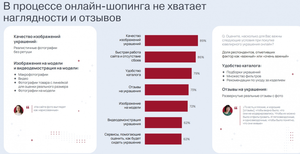 Онлайн-доставка ассоциируется у пользователей с большим удобством и экономией, среди рисков респонденты выделяют: непостоянство времени доставки в случае доставки курьером, отсутствие возможности примерки перед получением и уверенности в качестве украшения. Офлайн-покупка приобретает большую значимость для покупателя с точки зрения возможности примерки украшения, оценки его внешнего вида и размерного соответствия. Основными барьерами в покупке украшений в физических магазинах стали излишняя навязчивость консультантов, ограниченность ассортимента, дискомфортная обстановка в магазине, высокие цены и общее нежелание тратить время на долгий и не всегда эффективный поход по магазинам.