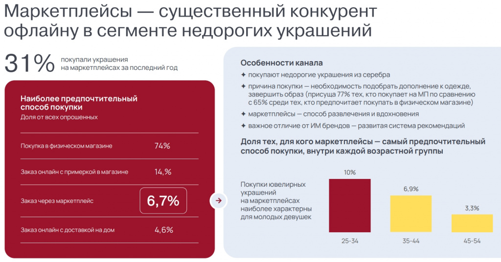 Существенным конкурентом специализированным ювелирным сайтам стали маркетплейсы. Здесь 31% опрошенных уже приобретали украшения, а для 6,7% этот канал стал основным. Покупки на маркетплейсах чаще совершают молодые девушки: 10% женщин в возрасте 25-34 лет предпочитают маркетплейсы, тогда как среди женщин 45-54 лет их доля составляет лишь 3,3%.