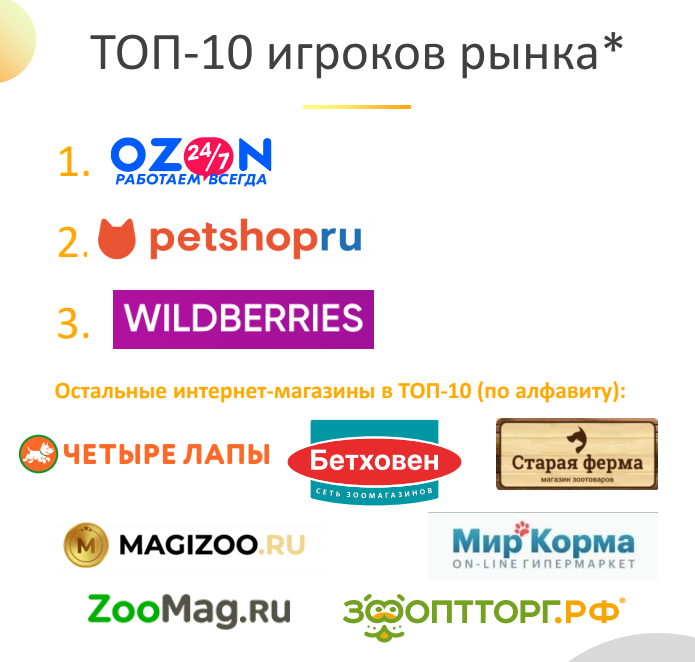 Первое место в рейтинге (по объему продаж) занял Ozon.ru, его доля на рынке составляет 27%. Второе и третье места – Petshop.ru и Wildberries.ru соответственно.