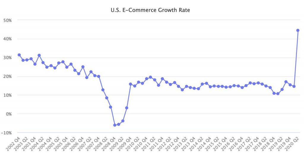 Объёмы продаж в американских онлайн-магазинах выросли во втором квартале финансового года на 44% или $62 млрд (до $201 млрд без учета сезонных колебаний) год к году. Это самый большой скачок за всю историю сбора данных - с 2001 года.