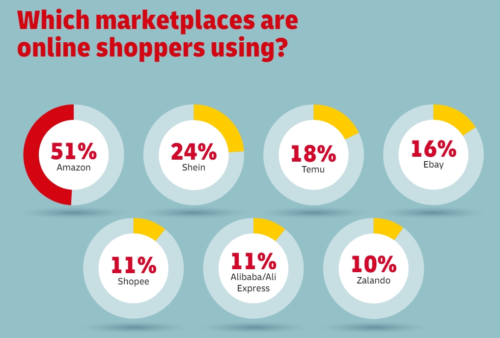 Безусловным лидером в eCommerce остаются маркетплейсы. Всего 3% онлайн-покупателей по всему миру не пользуются крупными eCommerce-площадками. Крупнейшей из них, конечно же, является Amazon. Его используют 51% опрошенных.