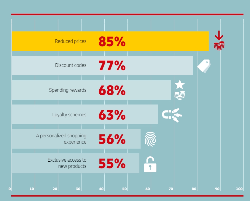 Что важнее всего для клиентов интернет-магазинов? Исследование демонстрирует очевидный тренд: современные онлайн-покупатели крайне чувствительны к цене. 85% из них при выборе товара оценивают скидки, а 77% коллекционируют купоны. Также респонденты упомянули о важности наград за оценки товаров и программы лояльности.