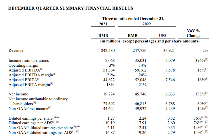 Alibaba Group с большим успехом закончила 3 квартал финансового года. Выручка компании составила $35,92 млрд, продемонстрировав рост на 2% год к году (в юанях, без учёта инфляции юаня к доллару). Операционная прибыль увеличилась сразу на 396% год к году, до $5,07 млрд. Чистая прибыль составила $6,79 млрд. Скорректированный показатель EBITA вырос на 16% в годовом исчислении и достиг $7,55 млрд.