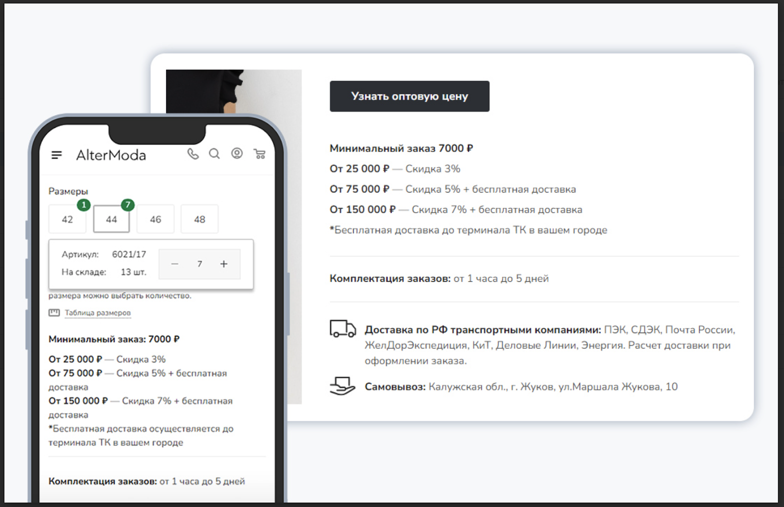 Компания предоставляет оптовикам скидки в зависимости от объема заказа. Система понятная и открытая — условия прописаны прямо в карточке товара.