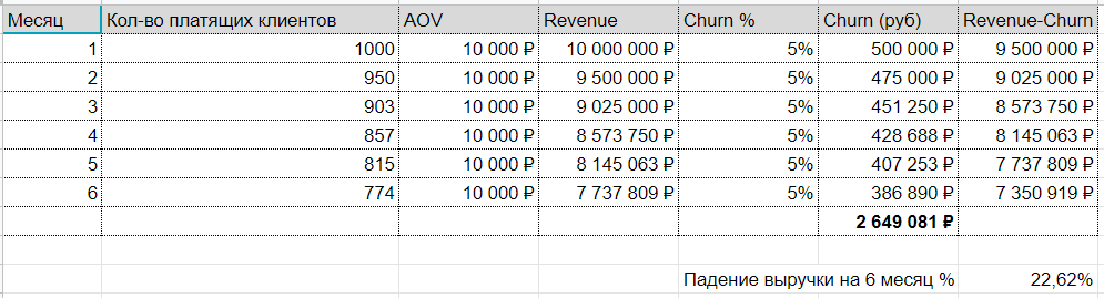 Например, возьмем гипотетический бизнес с тысячей платящих клиентов и средним чеком 10 тыс.руб. При 5%-м оттоке клиентов за 6 месяцев выручка упадет более чем на 22%. Даже для небольшого бизнеса это серьезные потери.