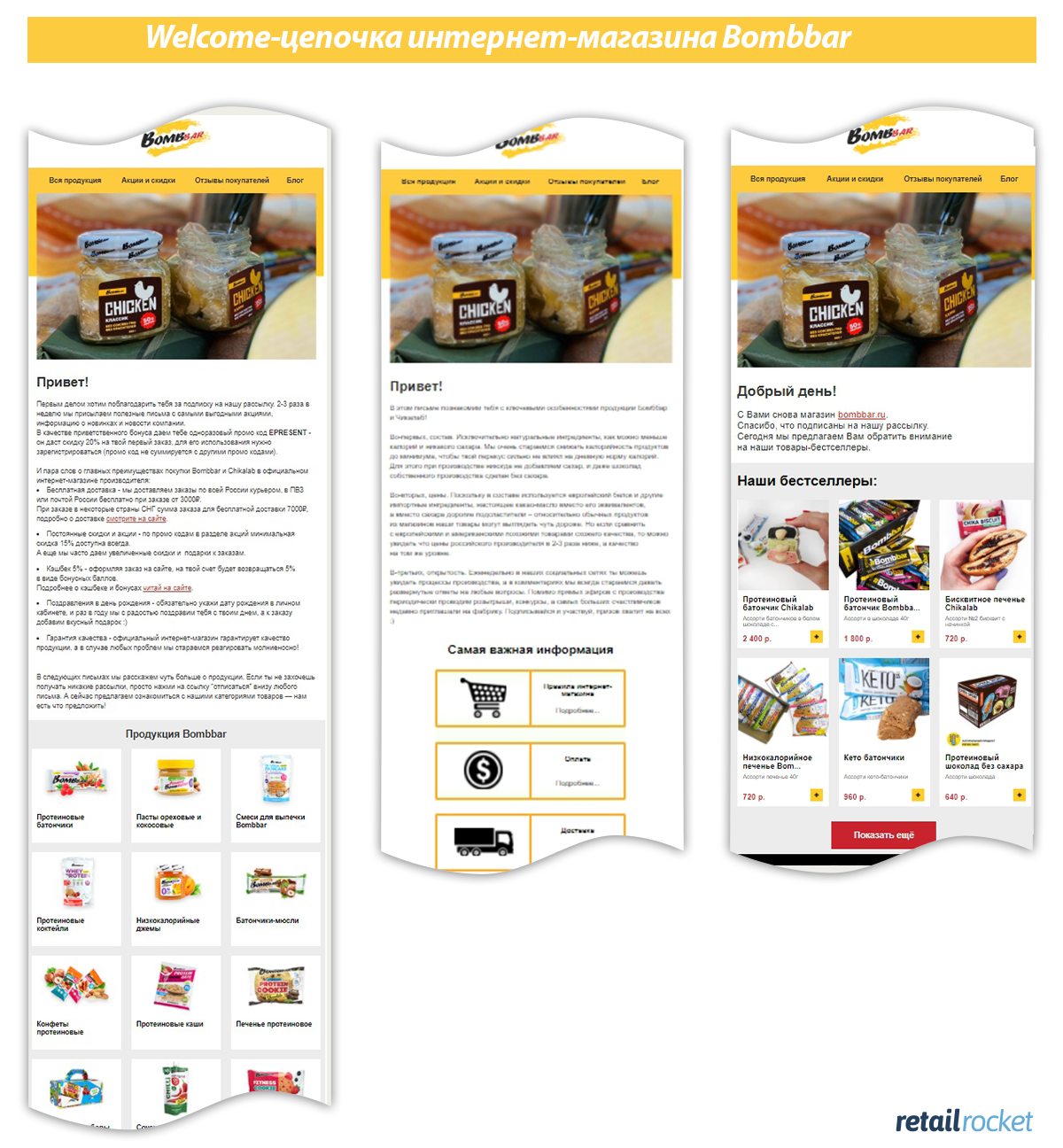 Чтобы поэтапно познакомить нового посетителя с интернет-магазином, отлично подойдет welcome-цепочка в email-канале. Например, интернет-магазин здорового питания Bombbar отправляет приветственную цепочку из трех писем:
