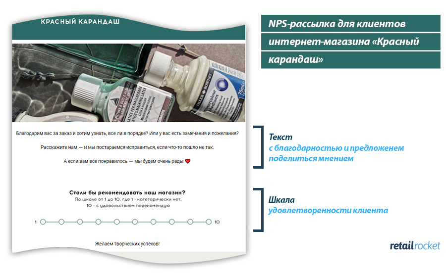 Оценка удовлетворенности и лояльности клиентов позволит всегда быть в курсе того, что нравится покупателям магазина, а что, по их мнению, требует улучшения. Индекс NPS позволяет оценить уровень удовлетворенности клиентов после взаимодействия с компанией, и именно такую рассылку получают покупатели интернет-магазина товаров для творчества «Красный карандаш»: