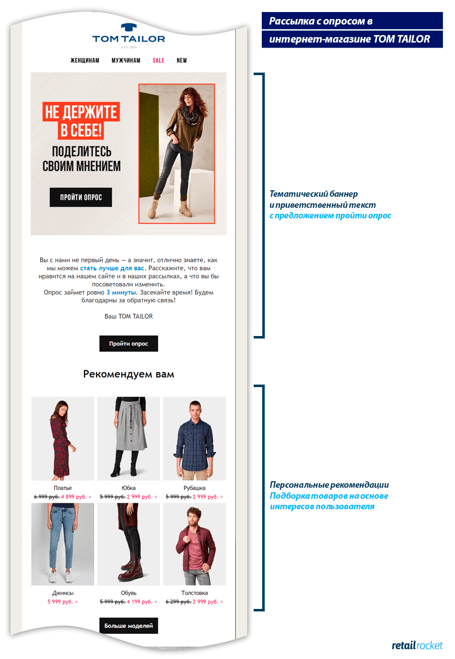 Еще одна возможность понять, что, по мнению покупателей, не так с вашим магазином, — дать клиентам возможность высказать свое мнение в email-канале. Так вы не только продемонстрируете, как их цените, но и поймете, какие процессы требуют оптимизации. Email-опрос, как лакмусовая бумажка, покажет, в каком направлении выстраивать антикризисную стратегию. Вот пример такого письма от магазина Tom Tailor: