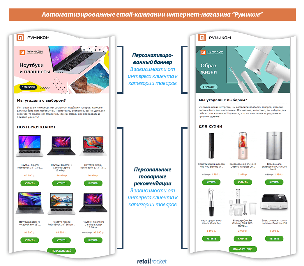Клиенты, которые делают покупки в одной категории, могут совершенно не интересоваться товарами из других разделов интернет-магазина, поэтому их можно сегментировать по категориям и предлагать релевантные товарные подборки, как это делает компания “Румиком”: