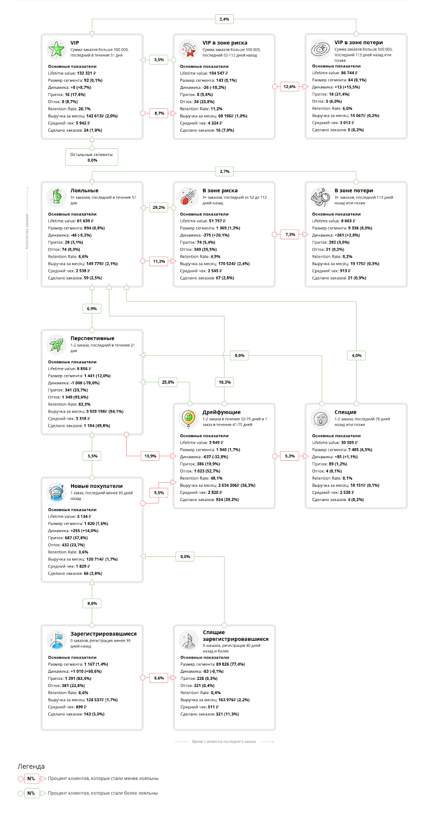 На основе умной математической модели для каждого магазина строится матрица удержания. С ее помощью ритейлер может увидеть, как двигаются покупатели между сегментами, какие сегменты растут, а какие требуют внимания. Анализируя данные по перемещению клиентов из одного сегмента в другой, вы можете понять, на что обратить внимание.