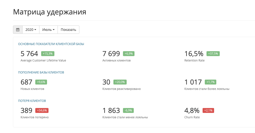А общий дашборд позволяет отслеживать ключевые показатели и дает ответ на вопрос, что случилось с моей клиентской базой за определенный период: