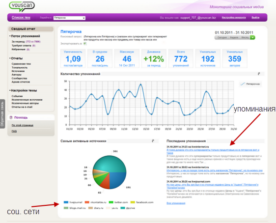 С отслеживанием упоминаний в Вконтакте ситуация обстоит сложнее. Бесплатных решений пока не найдено (будем рады, если предложите их в комментариях). Довольно простой и удобный инструменты - сервис http://www.babkee.ru от владельцев сервиса Rokee (стоимость мониторинга около 2000 рублей в месяц) и http://www.youscan.ru (стоимость порядка 5000 рублей в месяц), позволяющие следить за такими соц. сетями как Живой журнал, Твиттер, Вконтакте, Фейсбук, а также проводить анализ заданных пользователем сайтов на нахождение в них указанных ключевых слов. Принципиальной разницы между ними в ходе тестирования замечено не было, поэтому пользоваться можно менее затратным.