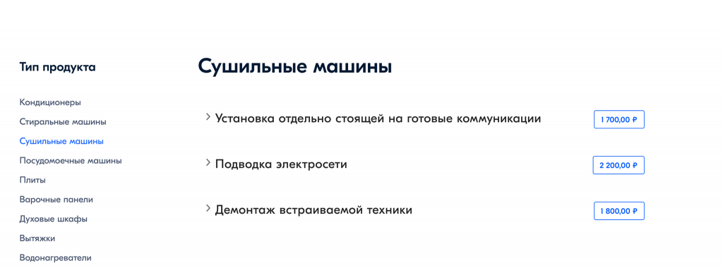 Для того, чтобы воспользоваться новым сервисом, клиенту необходимо выбрать категорию бытовой техники, тип услуги. Например, для стиральной машины возможно три вида установочных работ: