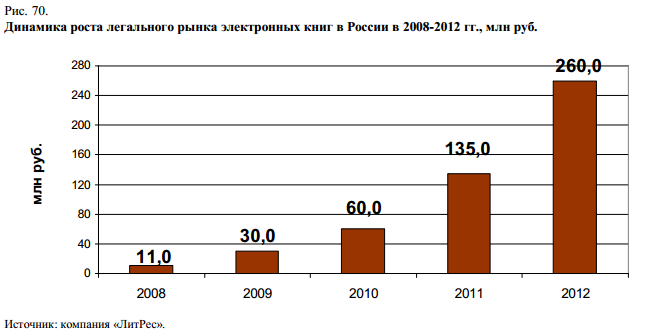 Несмотря на кажущийся перспективным график роста вверх, легальный рынок электронной книги по-прежнему не оказывает серьёзного влияния на базовые показатели развития отрасли. Доля легальной цифровой дистрибуции в 2012 году составляла около в 0,5% книжного рынка России. Тем не менее, по оценкам компании «ЛитРес», при сохранении сегодняшних темпов роста доля продаж легальной электронной книги к 2015-2017 гг. может составить уже 5% и более от общего объёма книжного рынка.