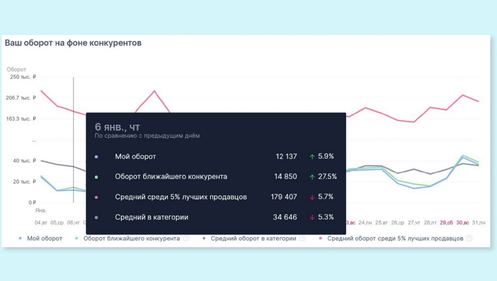 На графике сравнения с конкурентами продавец увидит свой оборот относительно: