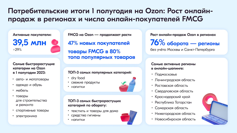 Онлайн-покупки набирают популярность в регионах, что подтверждает прогнозы аналитических агентств, - доля региональных покупателей (без учета Москвы и Санкт-Петербурга) на Ozon в обороте выросла до 76% по итогам первого полугодия 2023 (+2 пп).