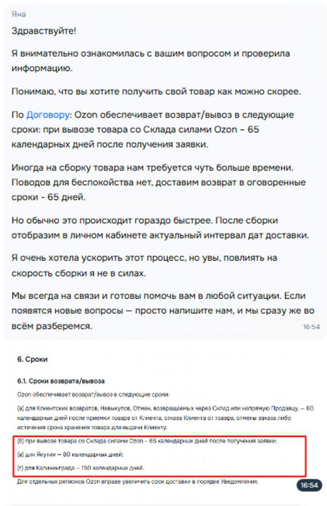 Параллельно всплыла вторая история - массовые задержки с вывозом остатков со складов. Селлеры подают заявки, но товар могут не собирать 30-60 дней. Статус висит, движение отсутствует, а платное хранение продолжает начисляться. По оферте Ozon вправе вывозить товар до 65 дней, а в Калининграде - до 150. Все это время продавец платит, даже если задержка полностью на стороне склада. Раньше вывоз занимал дни, сейчас проблема одновременно у нескольких магазинов и по всем новым заявкам.
