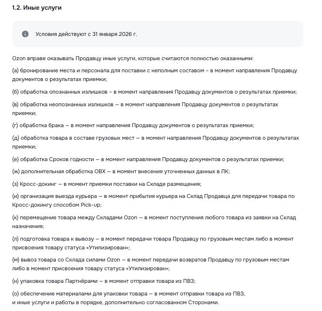 И еще один сигнал в ту же сторону. Ozon заранее фиксирует в оферте, что считать выполненной услугой, даже если продавец товар так и не увидел. С 31 января 2026 года доставка возврата считается оказанной в двух случаях: когда товар передан селлеру или когда ему присвоен статус "Утилизирован". Формально - уточнение момента оказания услуги. По факту - закрытие всех спорных зон.